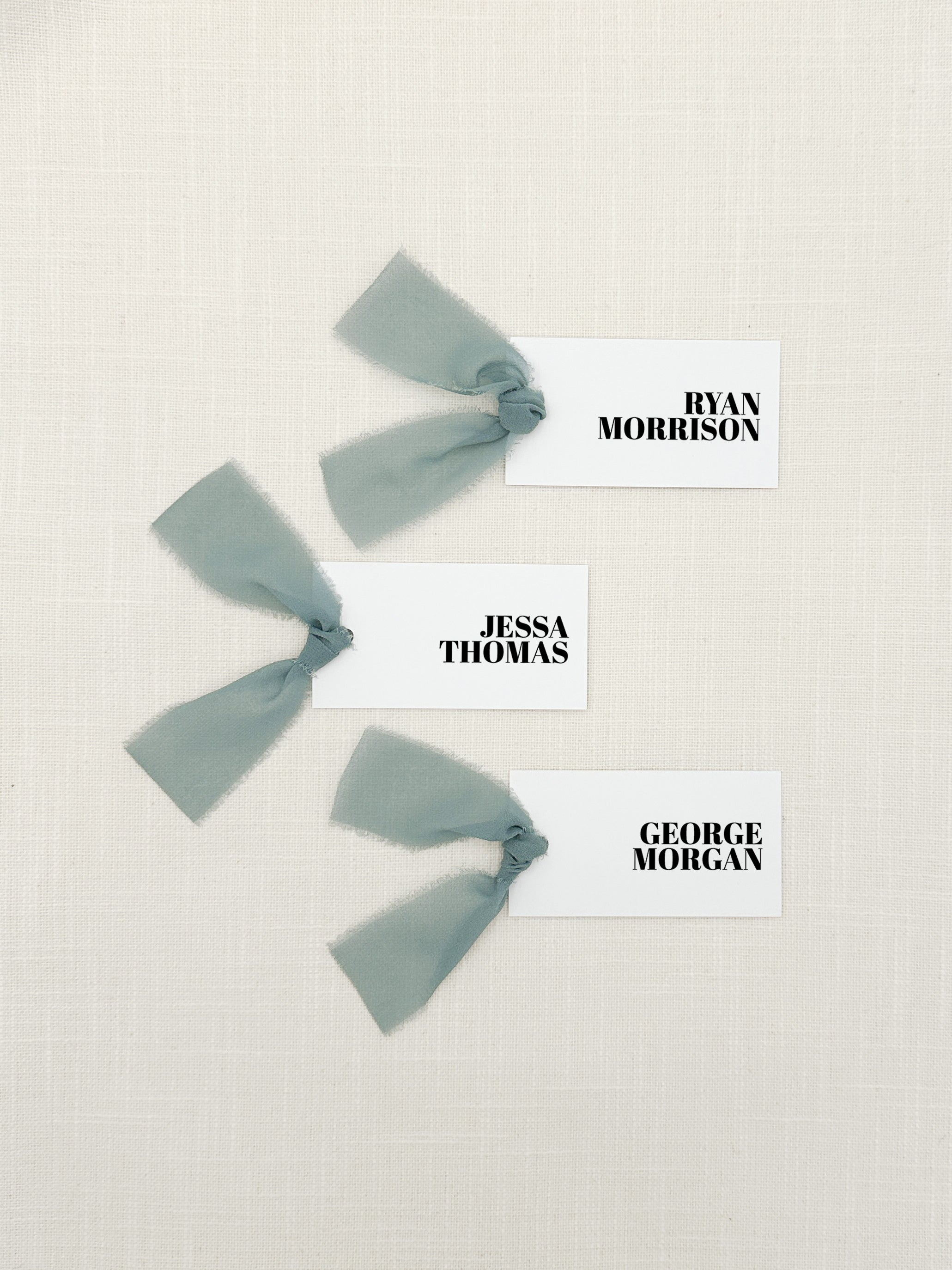 Bold Personalized Name Cards with Chiffon Ribbon that are printed for you with black ink on thick, smooth, white card stock and include the ribbon! You can choose the color of ribbon. Perfect for any occasion: